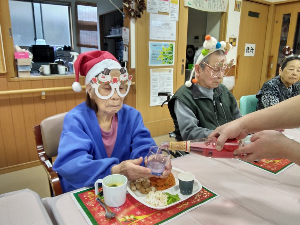 クリスマス会ではチキンライスやグリルチキンを提供し、シャンメリーで乾杯しました🥂